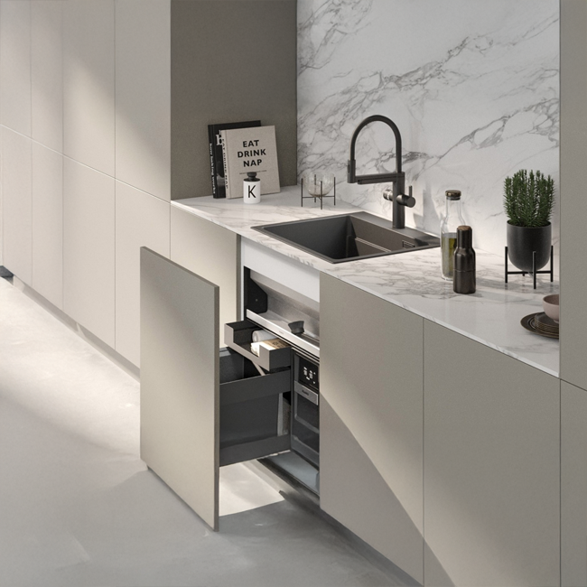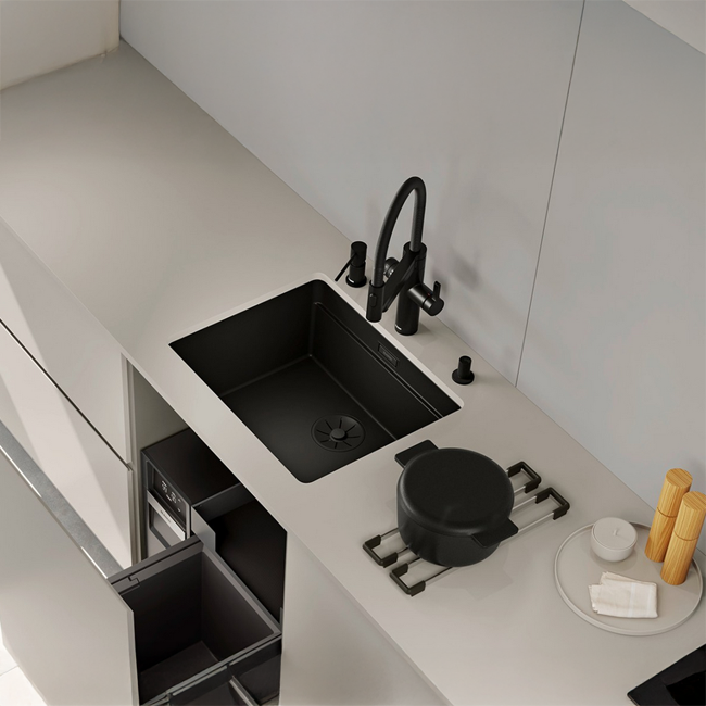 Esta versatilidad permite integrar el fregadero en islas centrales, encimeras en península, frentes con ventana o configuraciones lineales, siempre manteniendo la misma calidad técnica y visual.